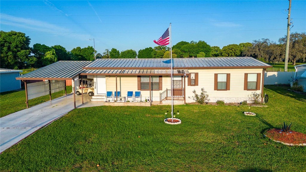 New Price! Looking for a winter getaway or a forever home? Discover this well-maintained double-wide in the desirable Oaks Royal 55+ Community, where you OWN the land and enjoy a low HOA fee of just $455/year. This home is nestled in a pet-friendly Florida neighborhood, perfect for relaxation and fun. Step inside through the spacious family room, an inviting extension of the living room, featuring updated laminate flooring and a ceiling fan. The living room boasts newer laminate flooring as well, seamlessly connected to the dining area and kitchen. Enjoy casual meals at the breakfast bar or host gatherings with ease, thanks to the built-in China cabinet in the dining area. The primary bedroom offers cozy carpeting, a ceiling fan, and a generous walk-in closet. The en suite bathroom features a step-in shower and vinyl flooring. The guest bedroom has laminate flooring and a double closet, with the second bathroom conveniently located nearby, complete with a tub/shower combo. For added convenience, the laundry area is located in the attached building under the carport and includes a washer, dryer, utility sink, and shelving for storage. Behind the laundry space, you'll find a workshop and golf cart garage with double doors for easy access—golf cart included! Relax and unwind on the covered lanai, perfect for enjoying the afternoon with friends or simply savoring the Florida breeze. This furnished home includes a central AC/heating system (new in 2022), metal roof, and numerous updates. VA, FHA, and conventional financing options are available. Schedule your appointment today and experience the vibrant lifestyle that Oaks Royal has to provide!