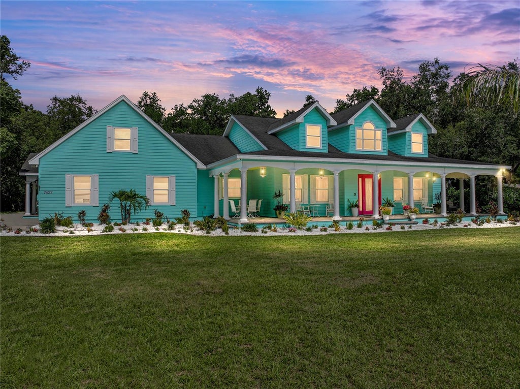 long driveway leads you through lush Florida landscaping to the classic covered front porch, a