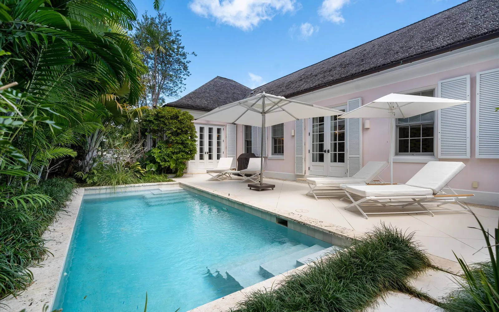 A delightful sunroom provides an inviting retreat, ideal for enjoying a morning coffee or unwinding with a book, and seamlessly opens onto the courtyard and pool area. The exquisitely landscaped poolside oasis offers a variety of seating, lounging, and dining spaces, enveloped by lush tropical foliage for the utmost privacy.