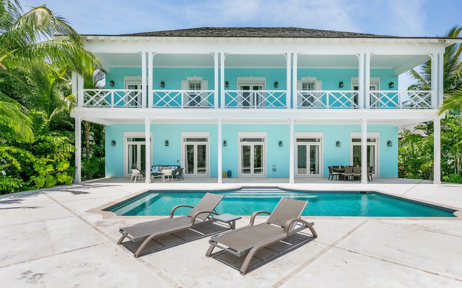 An elegant five-bedroom, five-bathroom colonial-style home is located on Bay Creek in the Islands of Old Fort. This contemporary home with high ceilings and large windows also has classic Caribbean features like coffered ceilings and deep verandas.