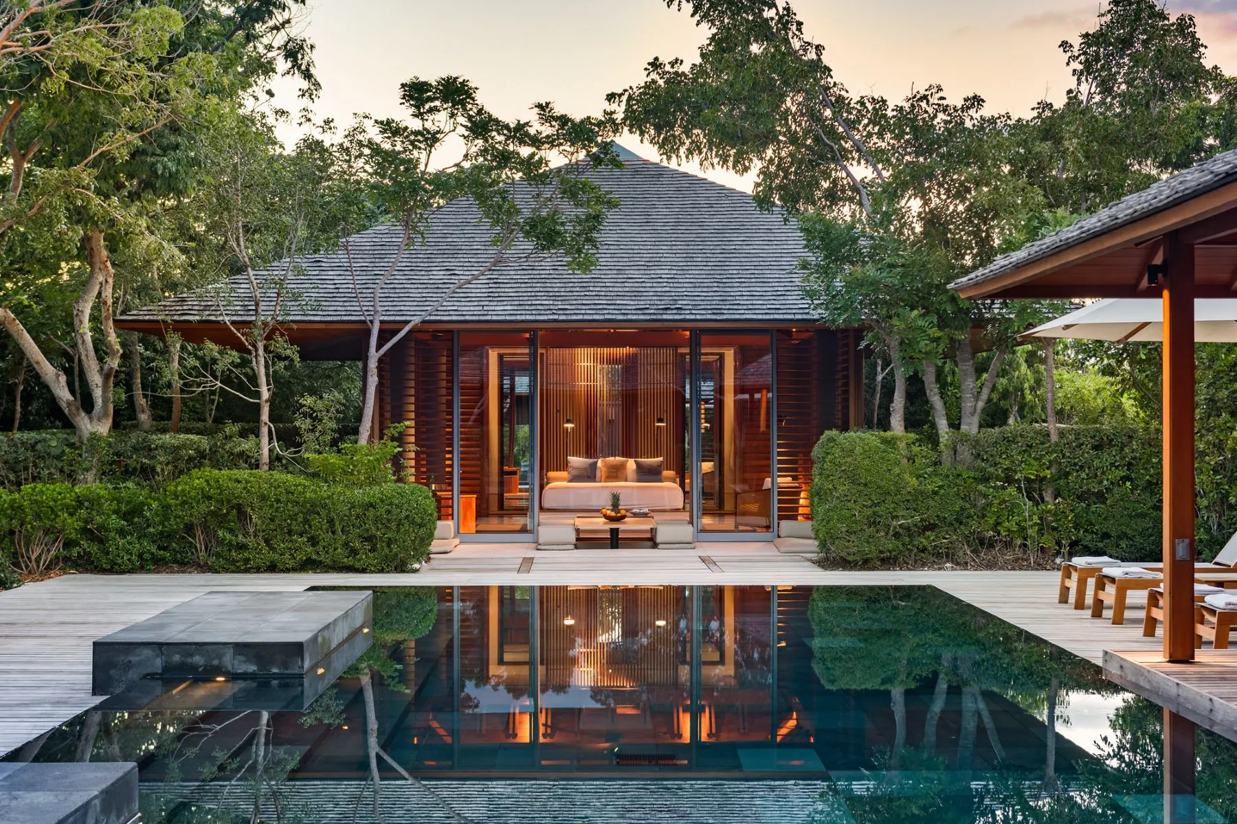 The villa features five impeccably designed bedroom pavilions, each standalone and thoughtfully positioned to ensure ultimate seclusion and tranquility for owners and their guests. The central living pavilion, with its elegant dining and lounge spaces, is encased by tall, beautifully crafted wooden doors that open to shaded outdoor lounge areas, seamlessly blending indoor and outdoor living.