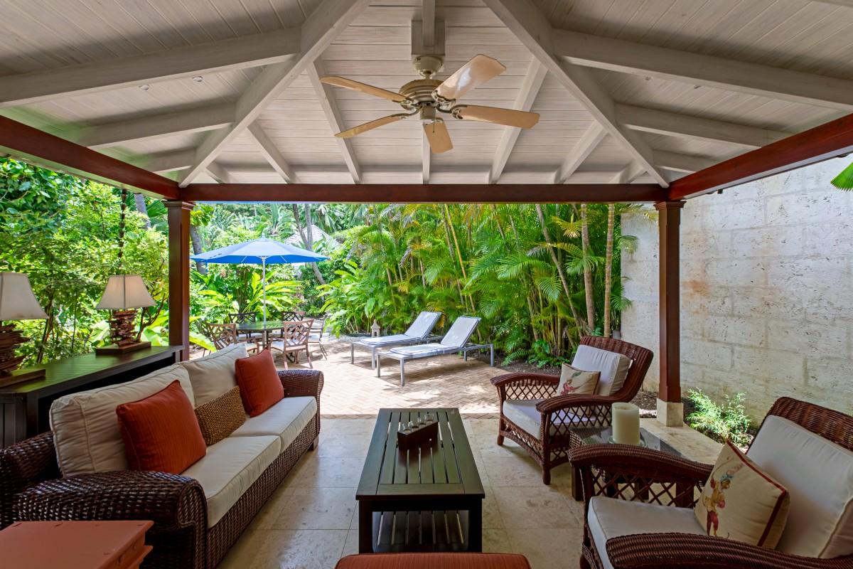 Villa 8 is spread over two levels of living space on 3,100 sq. ft. The ground floor has a spacious, flowing open plan design with third en-suite bedroom, kitchen, ample living, and entertainment space, leading into an intimate, covered seated terrace and directly to outside dining all tucked amongst dense tropical gardens with a traditional 6ft Swedish hot tub.